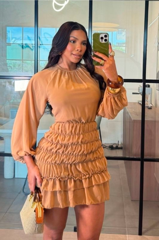 Vestido Corto Camel con Espalda Abierta y Falda Fruncida