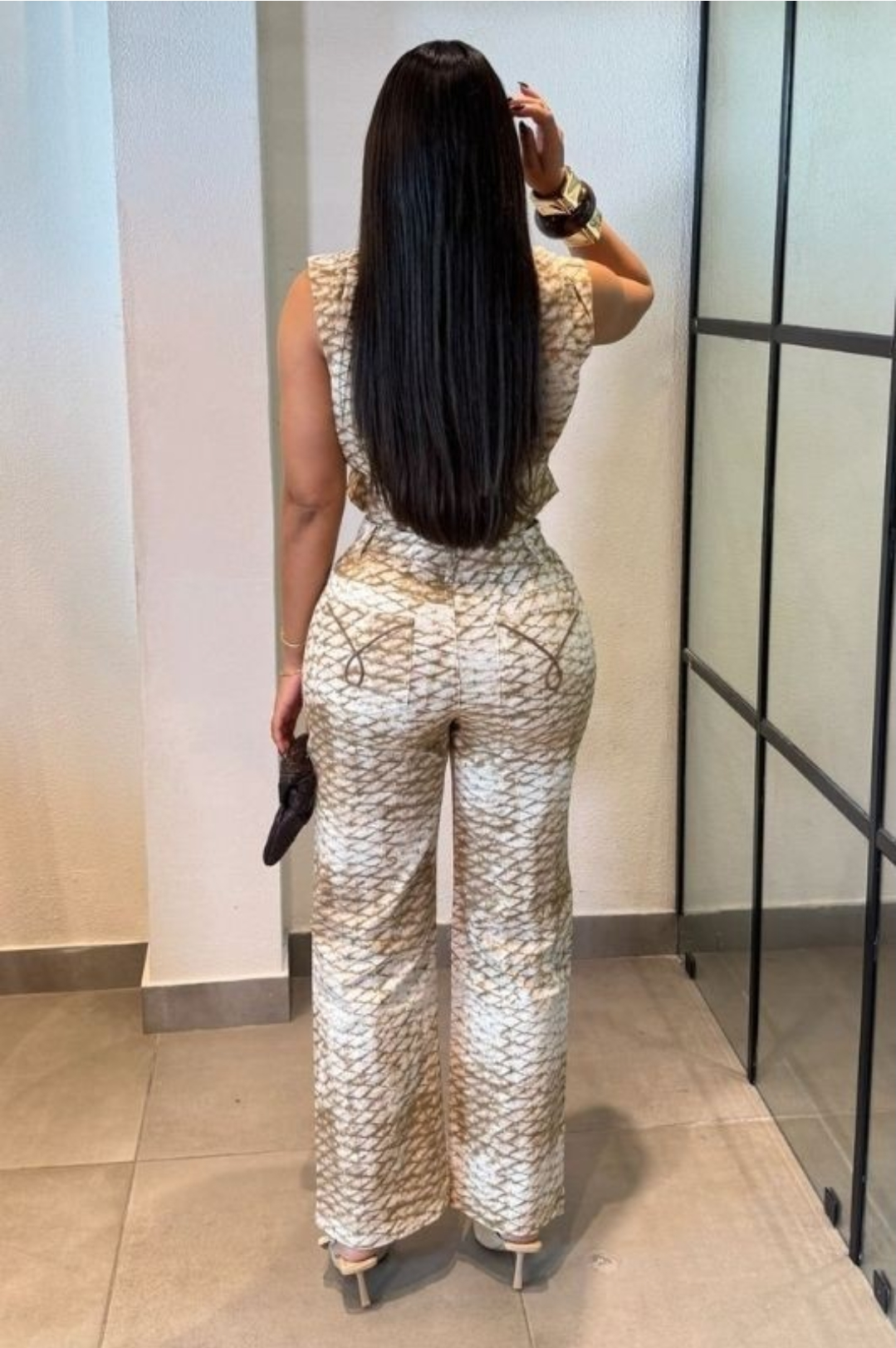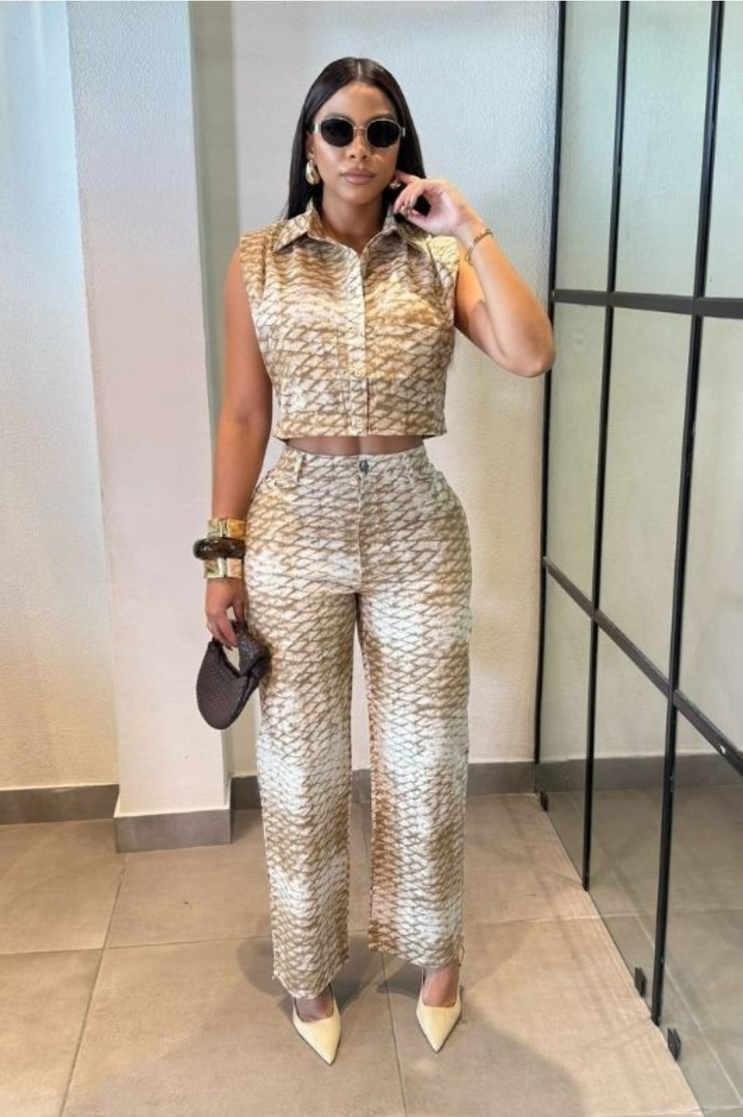 Eleva tu estilo con este set de dos piezas moderno y sofisticado, ideal para mujeres que aman destacar sin esfuerzo. Su diseño estampado en tonos beige y camel aporta un look elegante, versátil y muy trendy, perfecto tanto para el día como para la noche.
